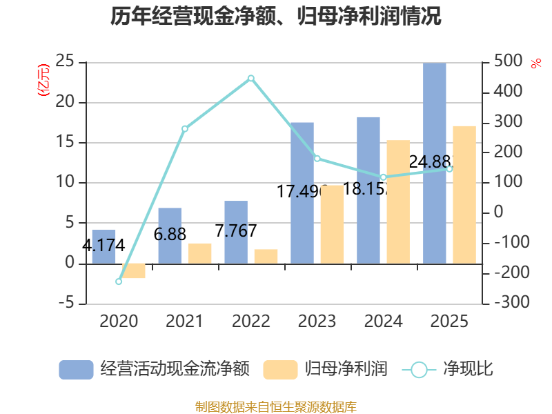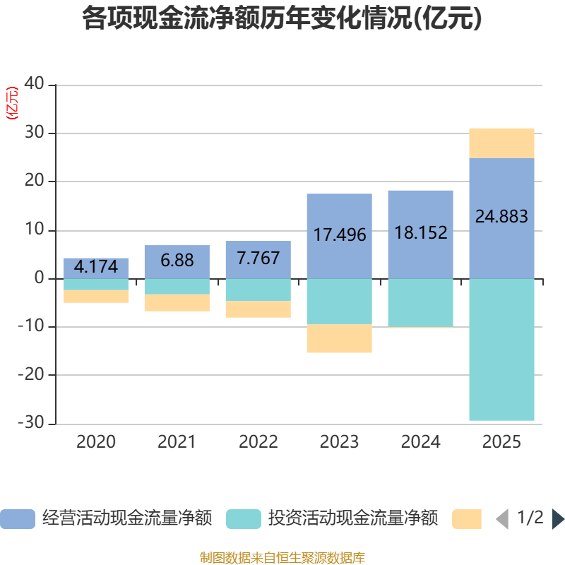 截至2025年,公司经营活动现金流净额为24.88亿元,同比增长37.08%;筹资活动现金流净额6.1亿元,同比增加6.33亿元;投资活动现金流净额-29.37亿元,上年同期为-10.04亿元。