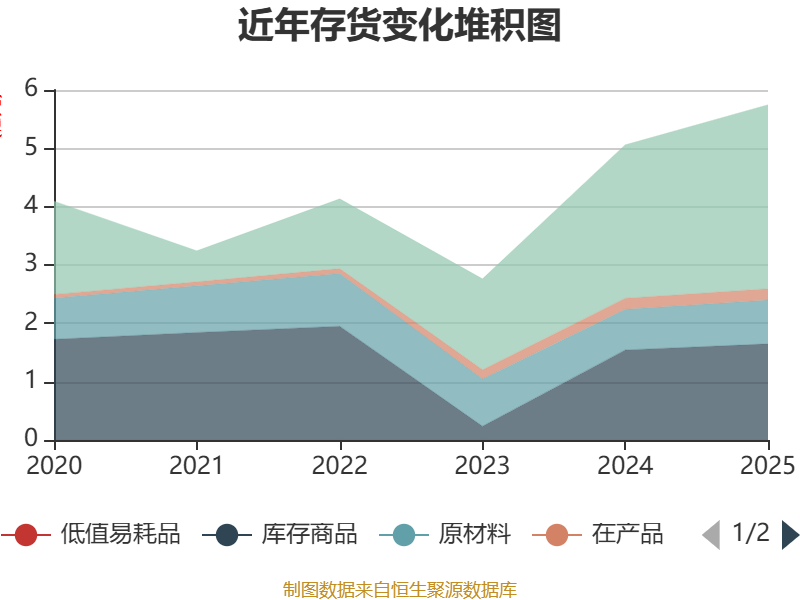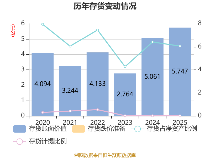 从存货变动来看,截至2025年末,公司存货账面价值为5.75亿元,占净资产的6.06%,较上年末增加6863.62万元。其中,存货跌价准备为4705.09元,计提比例为0%。