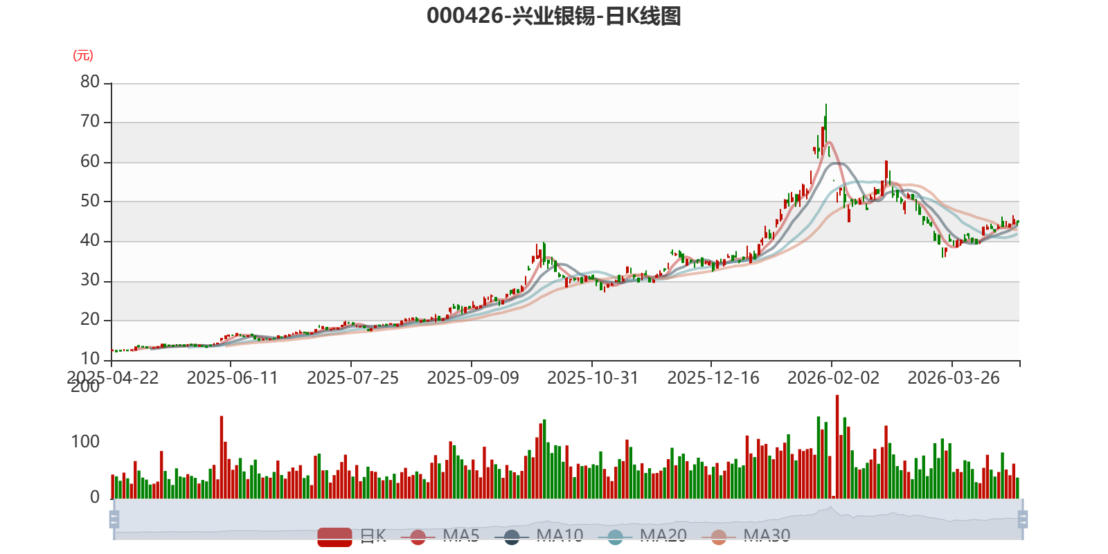 值得注意的是,中登公司数据显示,截至2026年4月17日,兴业银锡20.46%股份处于质押状态。年报显示,第一大股东内蒙古兴业集团有限公司质押3.63亿股公司股份,占其全部持股的100%。