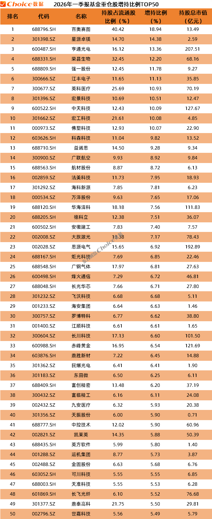 在个股占流通股比例增加TOP50的榜单中,百奥赛图位列第一,2026年一季度末基金持股占流通股比例从2025年末的21.48%增加至40.42%,增持了18.94%,持股数达到1450万股,总市值13.49亿元。