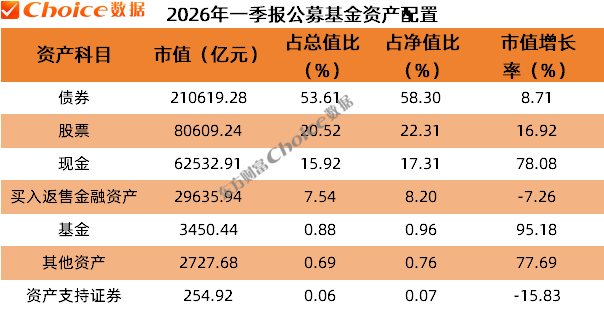 Choice数据显示,截至2026年一季度末,基金重仓持有量最多的资产类型为债券,持有市值21.06万亿元,占基金资产总值比例53.61%;其次为股票,持有市值8.06万亿元,占比20.52%。