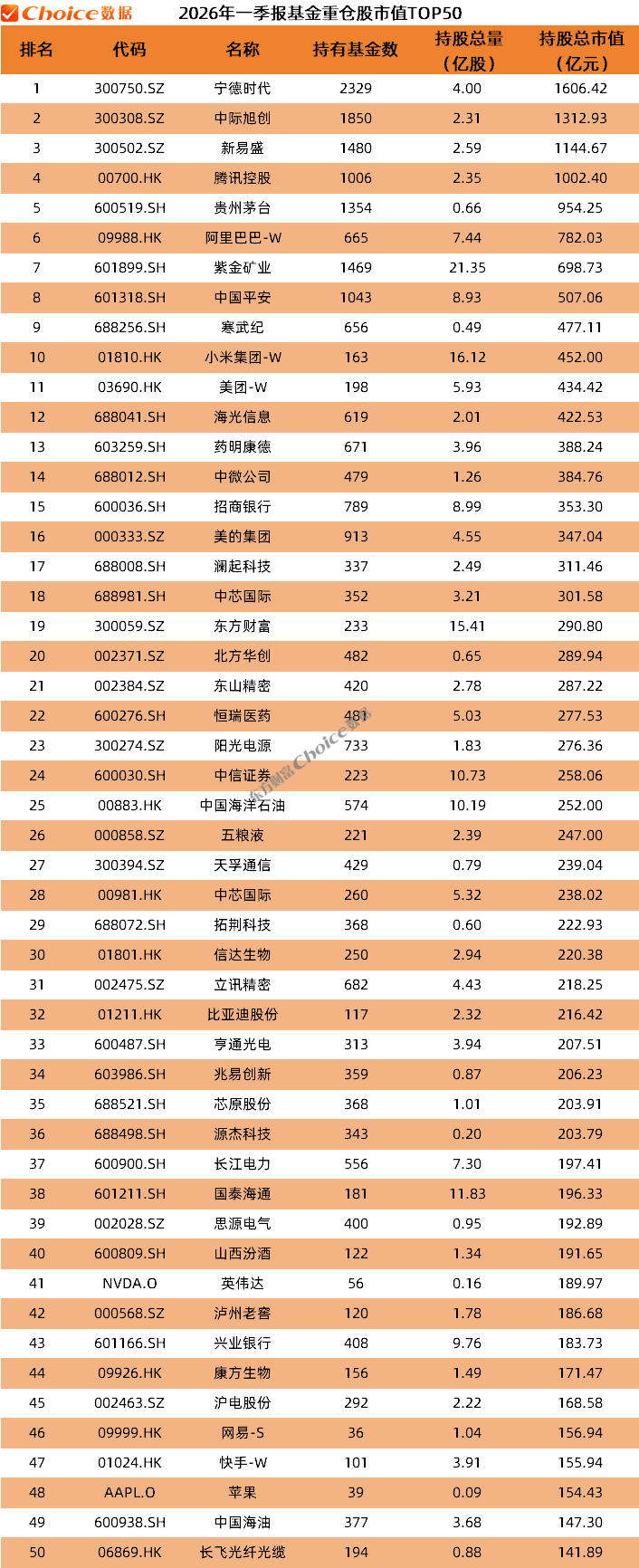在个股重仓基金数量榜单中,宁德时代位列首位,2026年一季报显示,共2329只基金重仓该股。