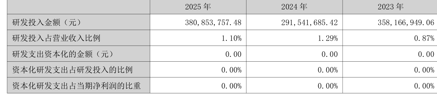 2025年全年,公司研发投入金额为3.81亿元,同比增长30.63%;研发投入占营业收入比例为1.1%,相比上年同期下降0.19个百分点。此外,公司全年研发投入资本化率为0%。