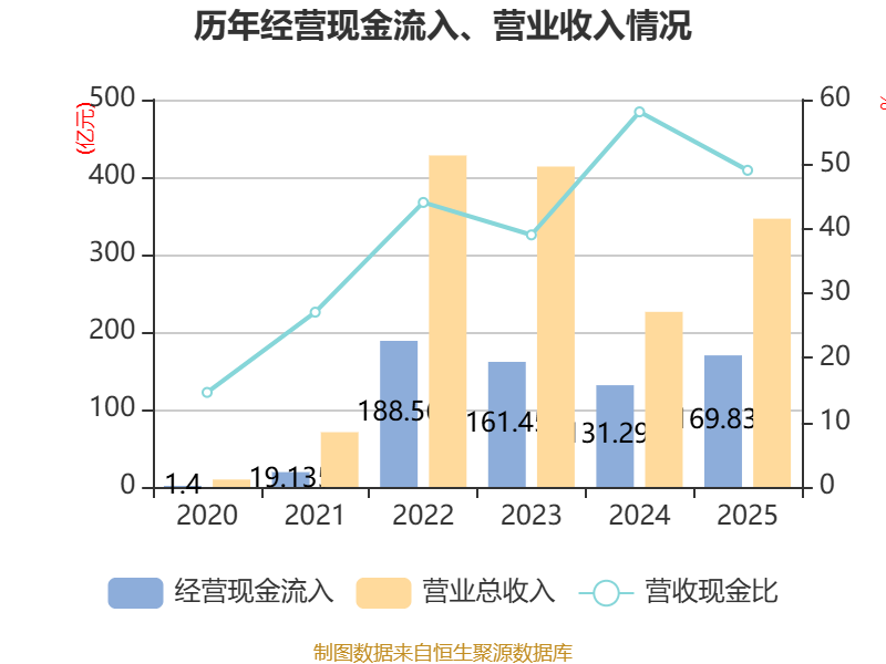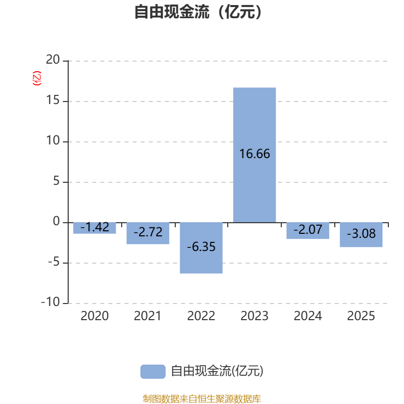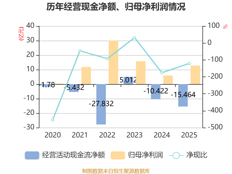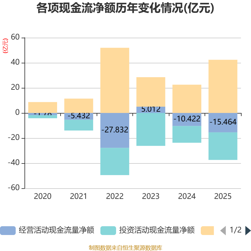 截至2025年,公司经营活动现金流净额为-15.46亿元,同比减少5.04亿元;筹资活动现金流净额42.36亿元,同比增加19.83亿元;投资活动现金流净额-21.96亿元,上年同期为-13.31亿元。