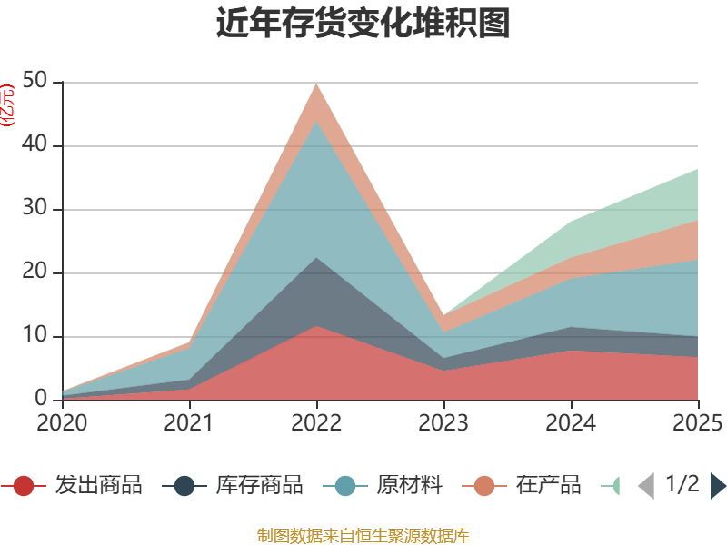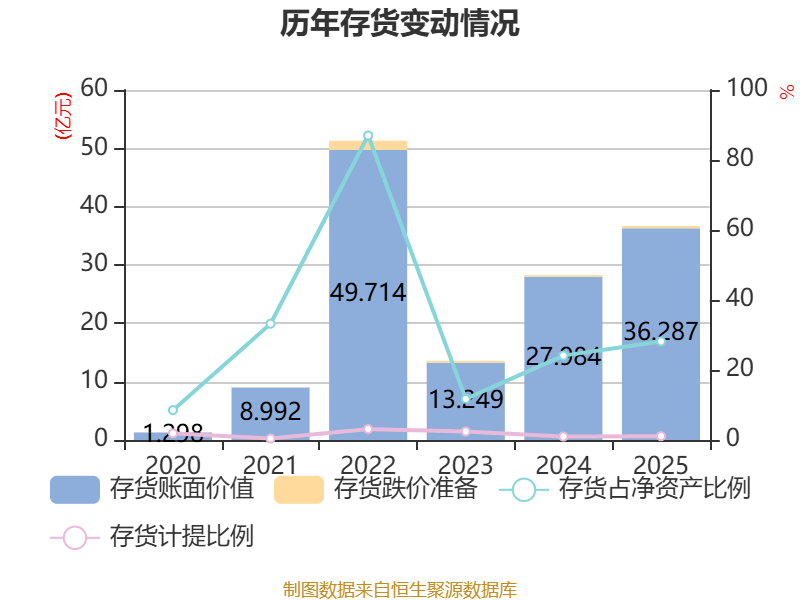 从存货变动来看,截至2025年末,公司存货账面价值为36.29亿元,占净资产的28.17%,较上年末增加8.3亿元。其中,存货跌价准备为4006.11万元,计提比例为1.09%。