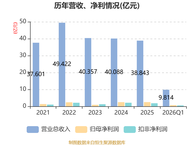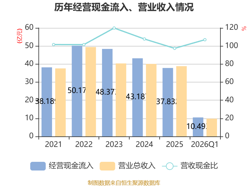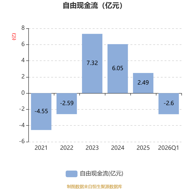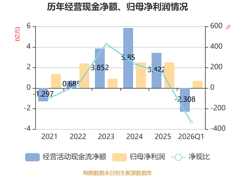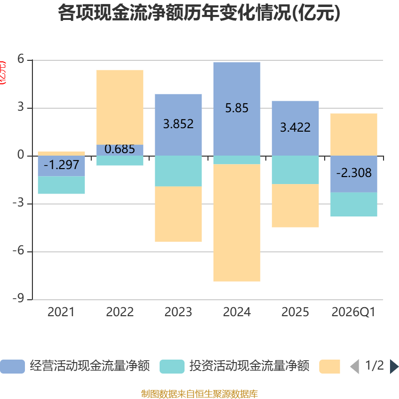 截至2026年一季度末,公司经营活动现金流净额为-2.31亿元,同比减少3.34亿元;筹资活动现金流净额2.64亿元,同比增加3.24亿元;投资活动现金流净额-1.5亿元,上年同期为-3302.01万元。