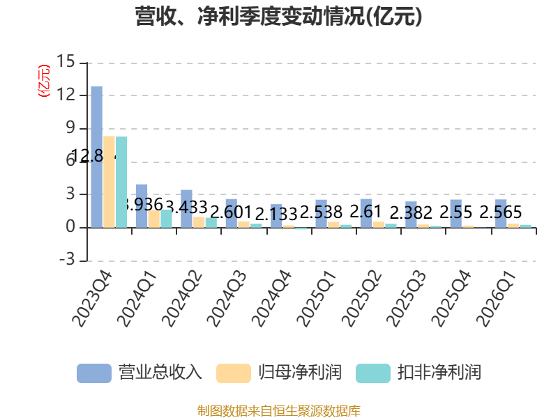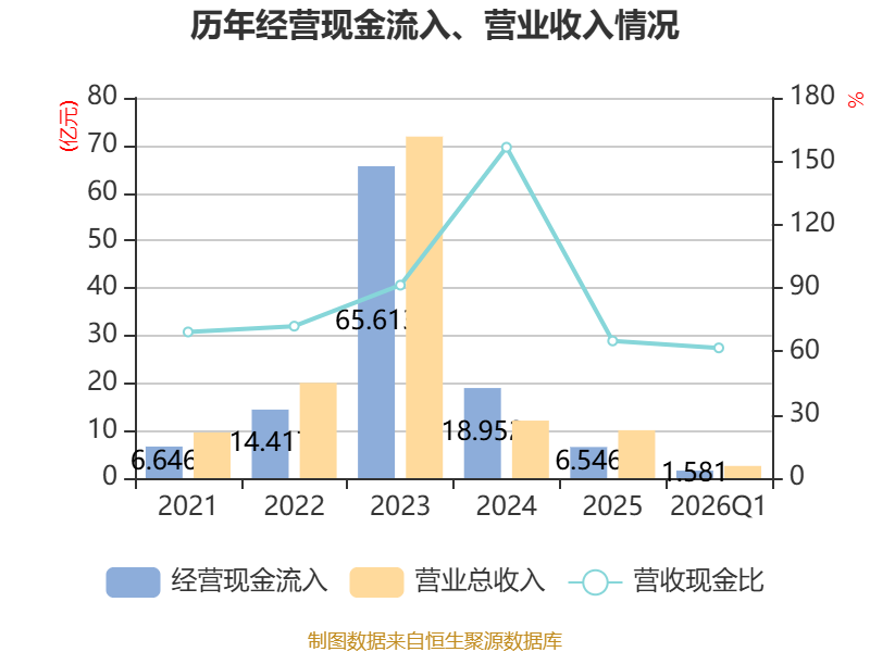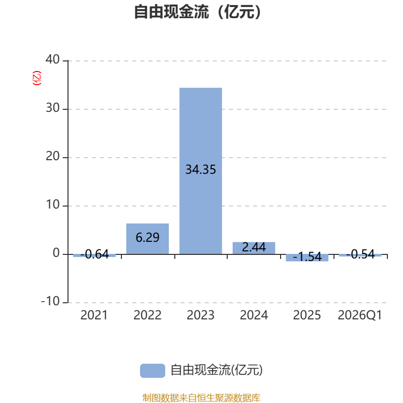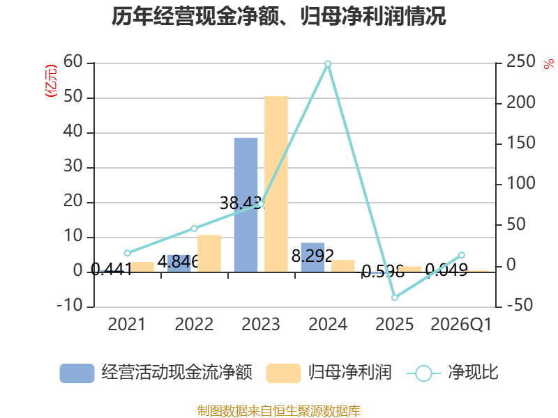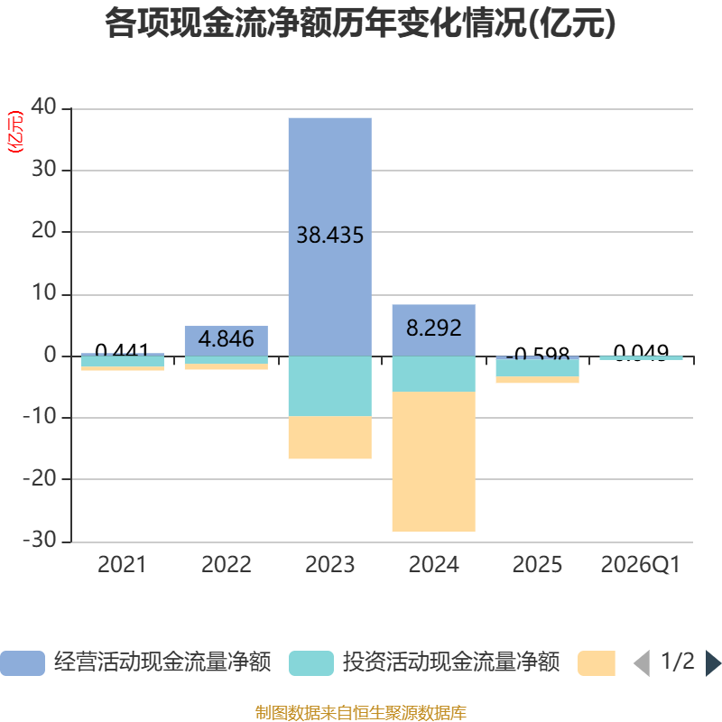 截至2026年一季度末,公司经营活动现金流净额为485.51万元,同比增加4817.4万元;筹资活动现金流净额-2.43万元,同比减少2.43万元;投资活动现金流净额-6811.46万元,上年同期为-6398.93万元。