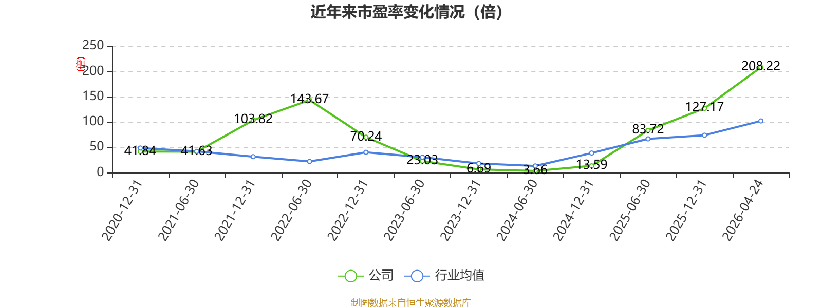 以4月24日收盘价计算,石英股份目前市盈率(TTM)约为208.22倍,市净率(LF)约4.89倍,市销率(TTM)约28.3倍。
