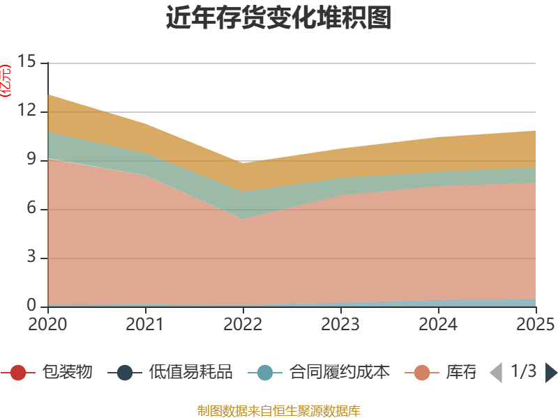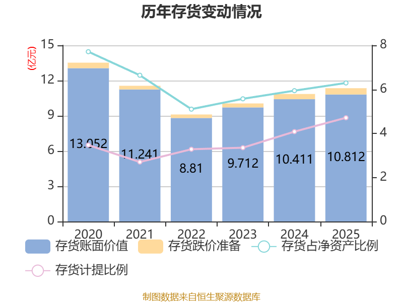 从存货变动来看,截至2025年末,公司存货账面价值为10.81亿元,占净资产的6.29%,较上年末增加4013.08万元。其中,存货跌价准备为5347.28万元,计提比例为4.71%。