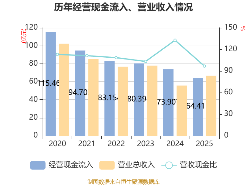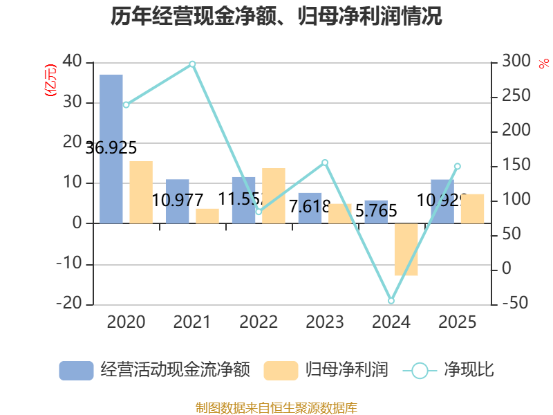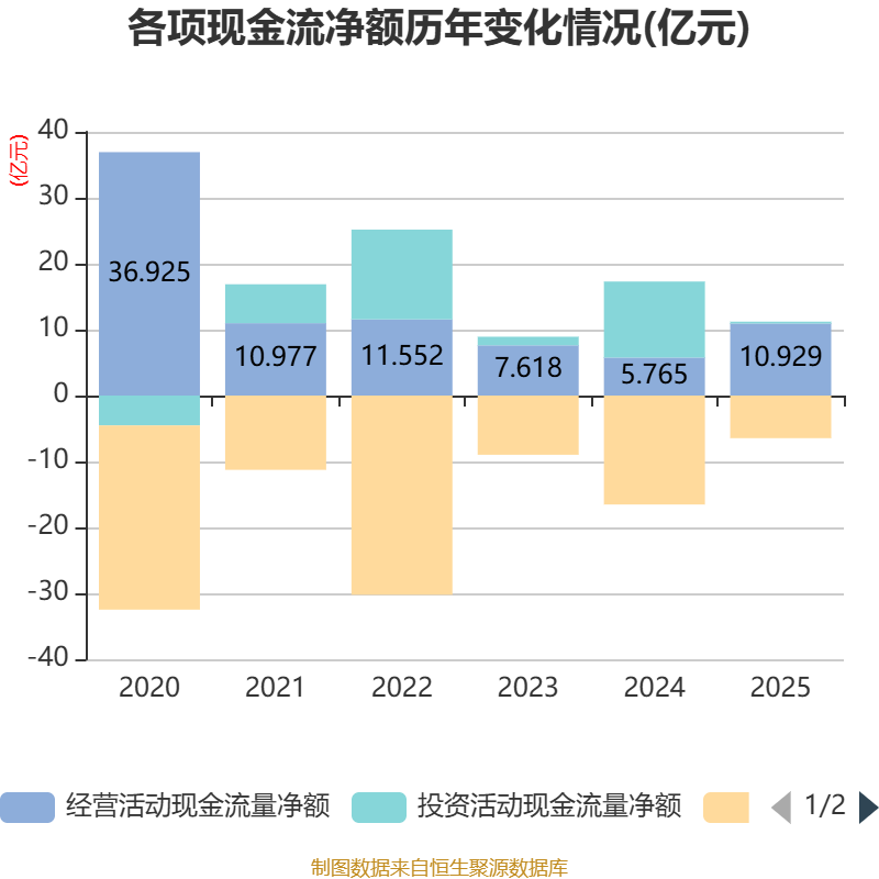截至2025年,公司经营活动现金流净额为10.93亿元,同比增长89.57%;筹资活动现金流净额-6.47亿元,同比增加10.06亿元;投资活动现金流净额2815.1万元,上年同期为11.53亿元。