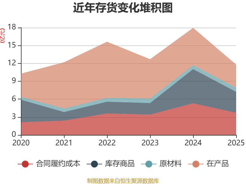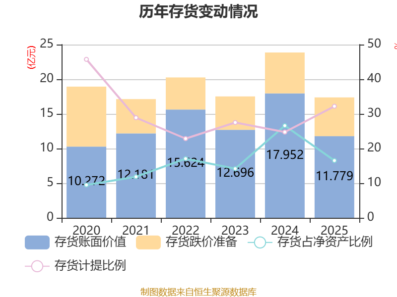 从存货变动来看,截至2025年末,公司存货账面价值为11.78亿元,占净资产的16.52%,较上年末减少6.17亿元。其中,存货跌价准备为5.59亿元,计提比例为32.19%。