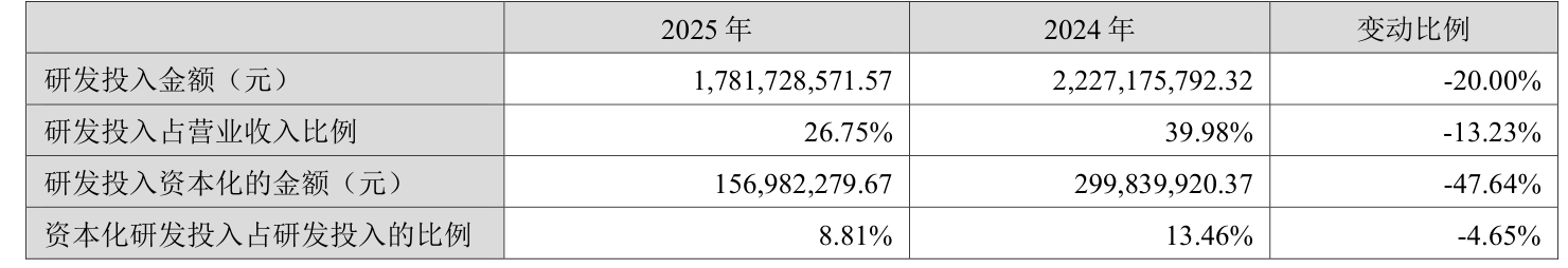 2025年全年,公司研发投入金额为17.82亿元,同比下降20%;研发投入占营业收入比例为26.75%,相比上年同期下降13.23个百分点。此外,公司全年研发投入资本化率为8.81%。