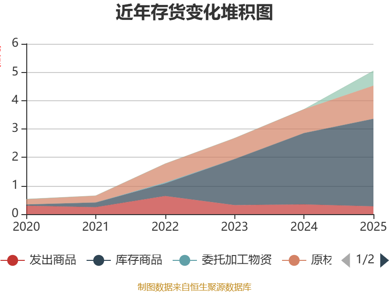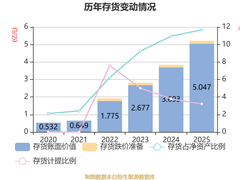 从存货变动来看,截至2025年末,公司存货账面价值为5.05亿元,占净资产的11.67%,较上年末增加1.35亿元。其中,存货跌价准备为1675.65万元,计提比例为3.21%。