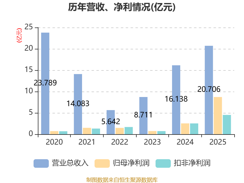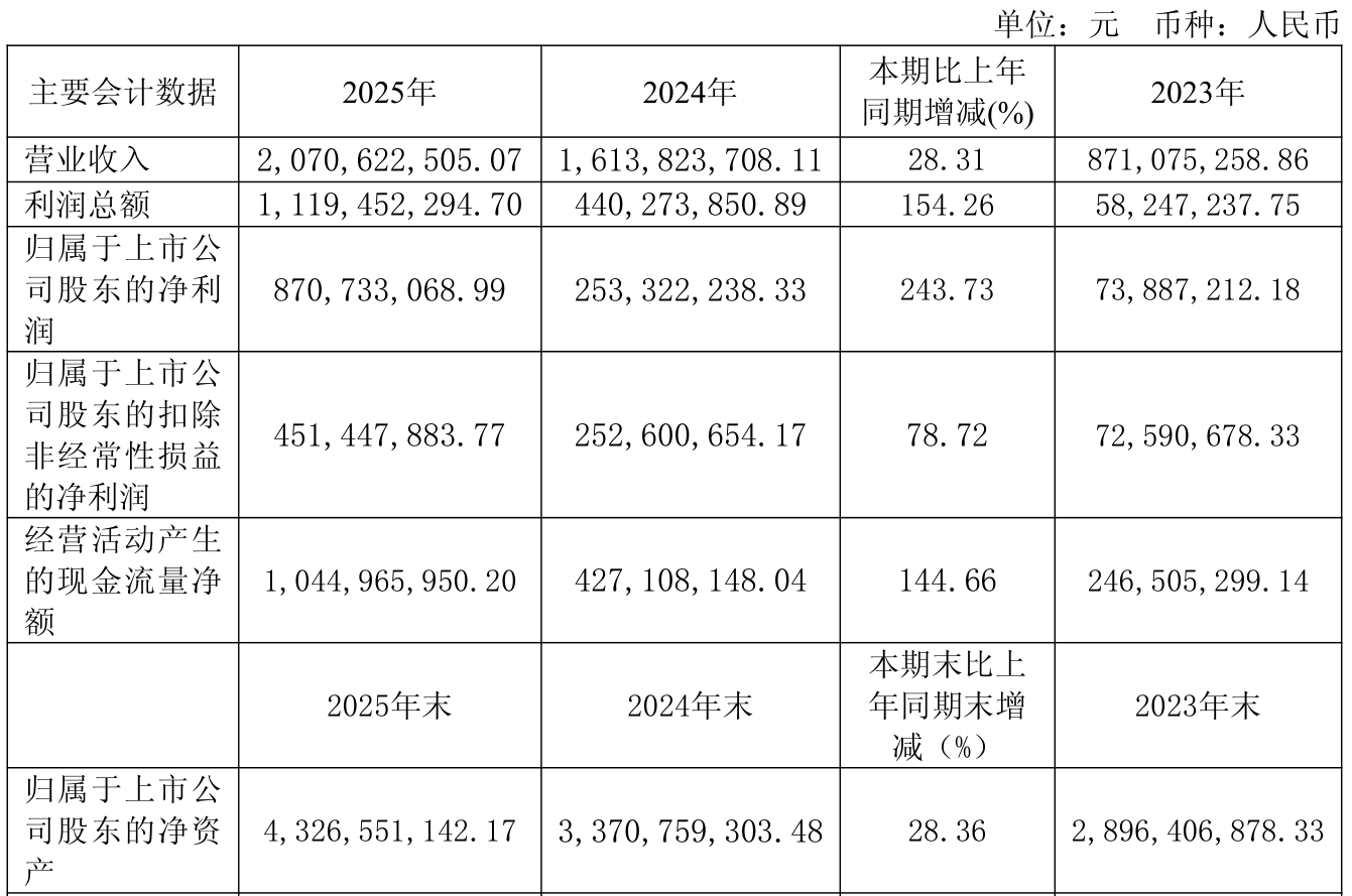 中证智能财讯华钰矿业(601020)4月29日披露2025年年度报告。2025年,公司实现营业总收入20.71亿元,同比增长28.31%;归母净利润8.71亿元,同比增长243.73%;扣非净利润4.51亿元,同比增长78.72%;经营活动产生的现金流量净额为10.45亿元,同比增长144.66%;报告期内,华钰矿业基本每股收益为1.06元,加权平均净资产收益率为17.61%。公司2025年度分配预案为:拟向全体股东每10股派现0.79元(含税)。