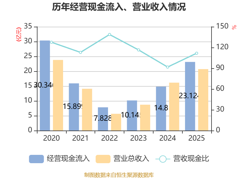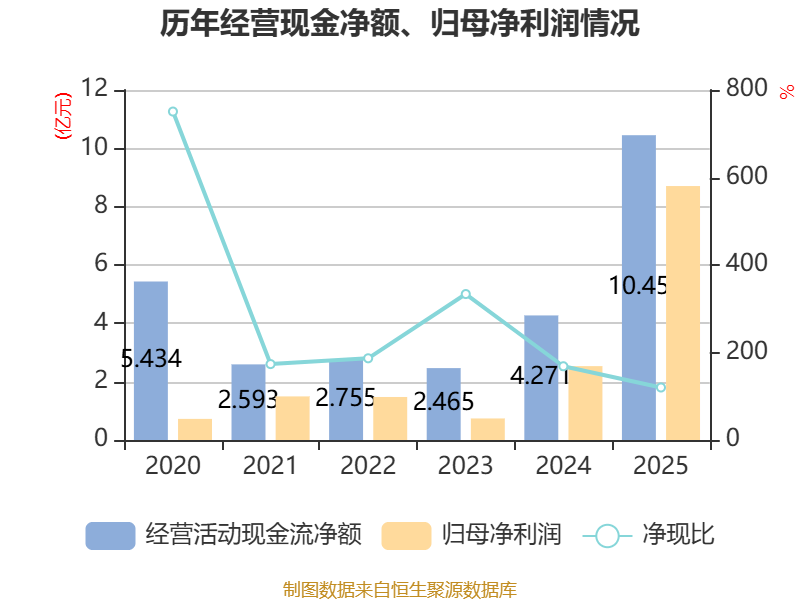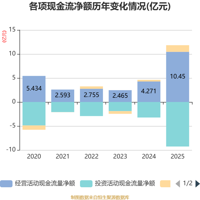截至2025年,公司经营活动现金流净额为10.45亿元,同比增长144.66%;筹资活动现金流净额1.39亿元,同比增加1.04亿元;投资活动现金流净额-9.27亿元,上年同期为-3.23亿元。