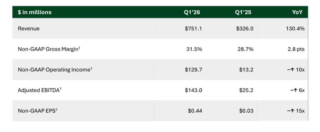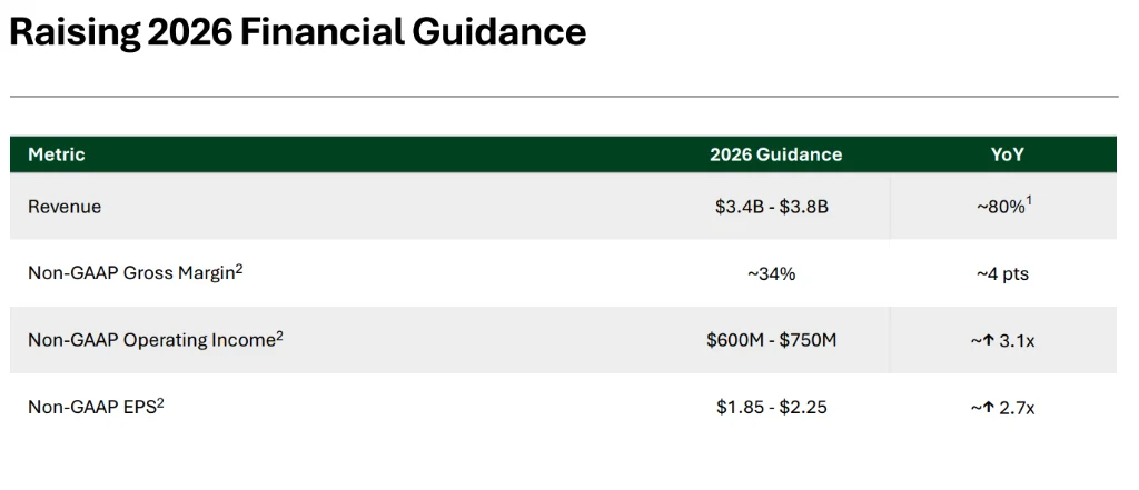 Bloom Energy将2026年全年营收指引从此前的31亿-33亿美元,大幅上调至34亿-38亿美元,增速中值从60%提升至80%。非GAAP毛利率指引上调至约34%。值得注意的是,新指引区间的下限,已高于旧指引的上限。