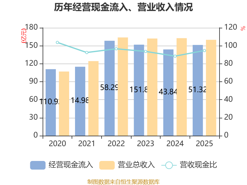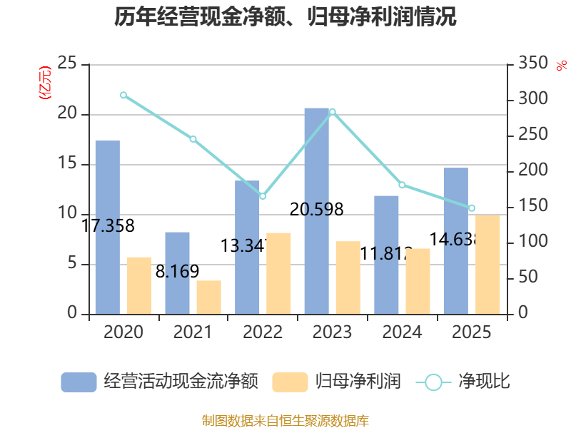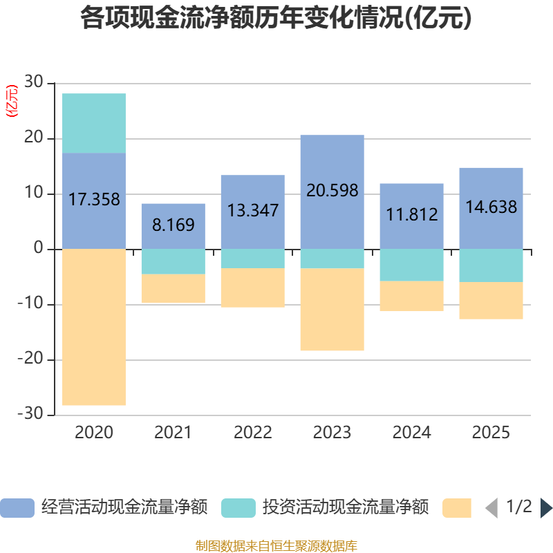 截至2025年,公司经营活动现金流净额为14.64亿元,同比增长23.92%;筹资活动现金流净额-6.71亿元,同比减少1.3亿元;投资活动现金流净额-6.01亿元,上年同期为-5.84亿元。
