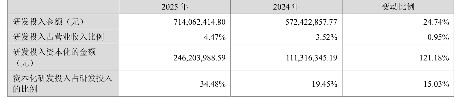 2025年全年,公司研发投入金额为7.14亿元,同比增长24.74%;研发投入占营业收入比例为4.47%,相比上年同期上升0.95个百分点。此外,公司全年研发投入资本化率为34.48%。