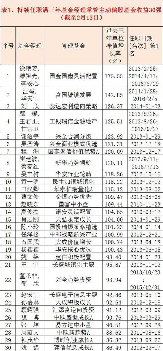 一、主动偏股基金三年期30强基金经理