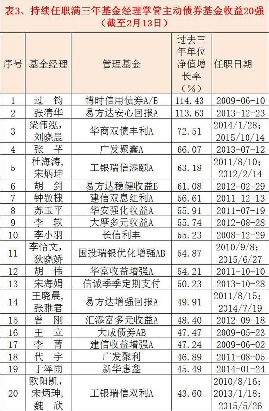 三、主动债券型基金三年期20强基金经理