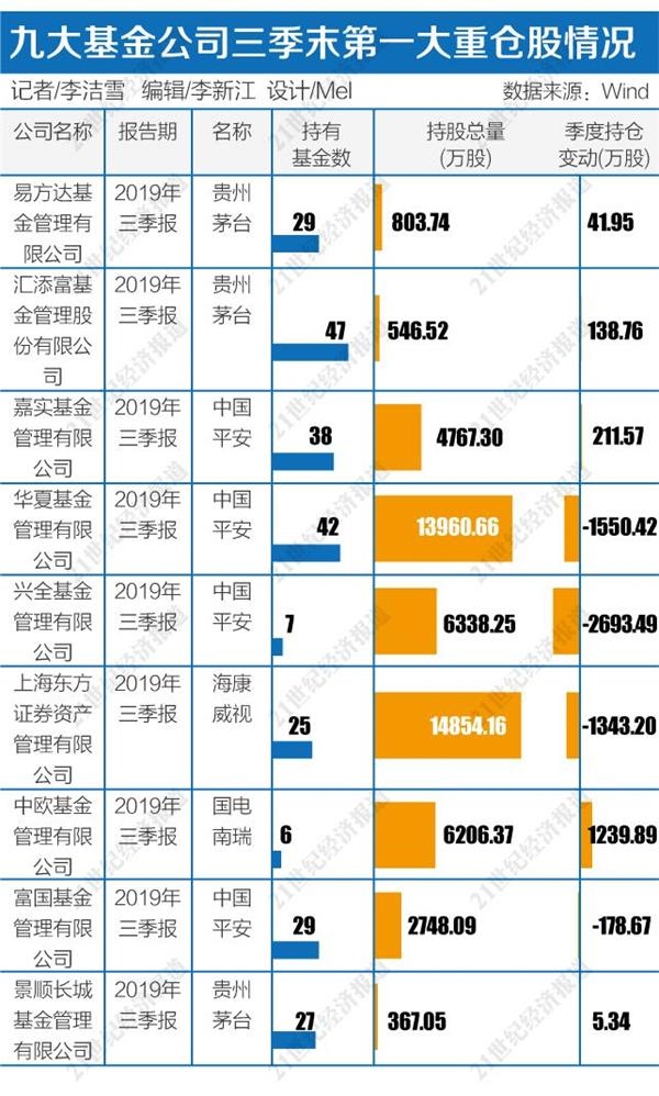 截至记者发稿前,上述10家基金公司中,除南方基金外,其余9家公司均已披露2019年三季报。21世纪经济报道记者梳理发现,这些公司在三季度对白马蓝筹股依然充满偏爱,但不同公司在具体持仓上还是存在明显的差异。